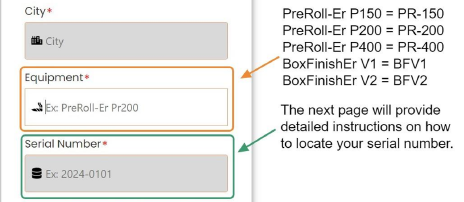 • If you have multiple machines (BoxFinish-Er and/or PreRoll-Er), please provide the name, serial number, and cycle count for each piece of equipment so we can grant you access to the relevant information in the portal.